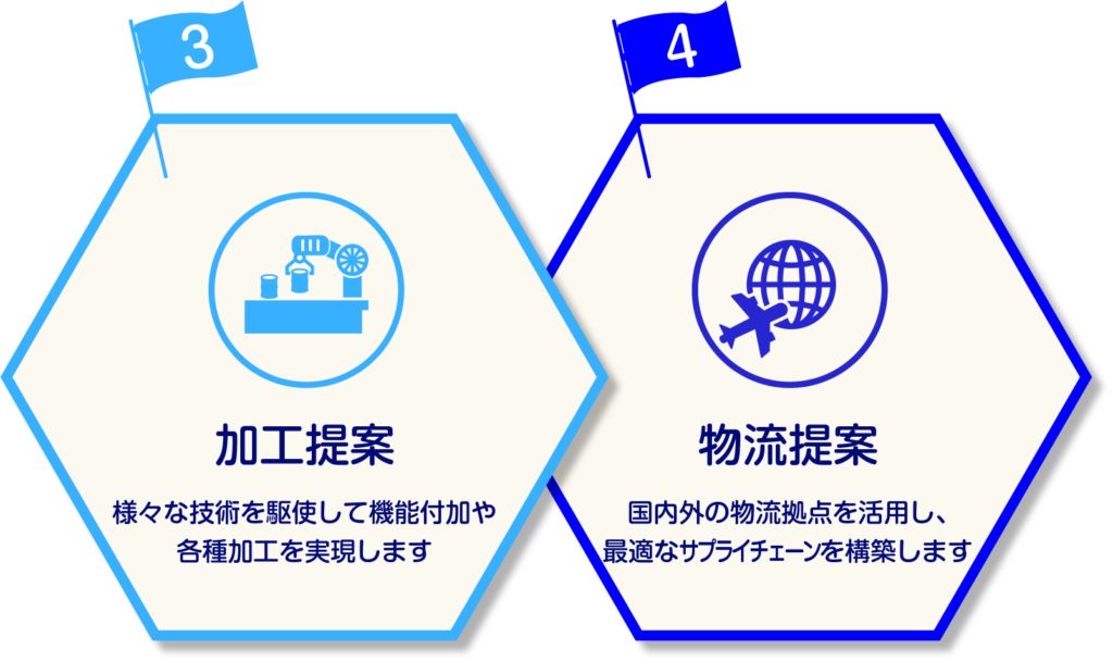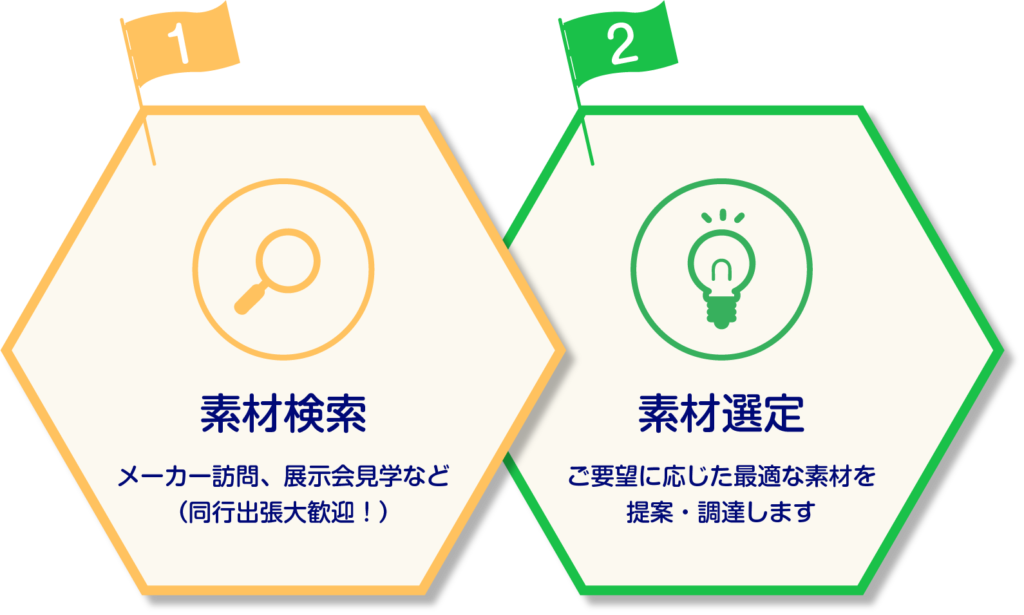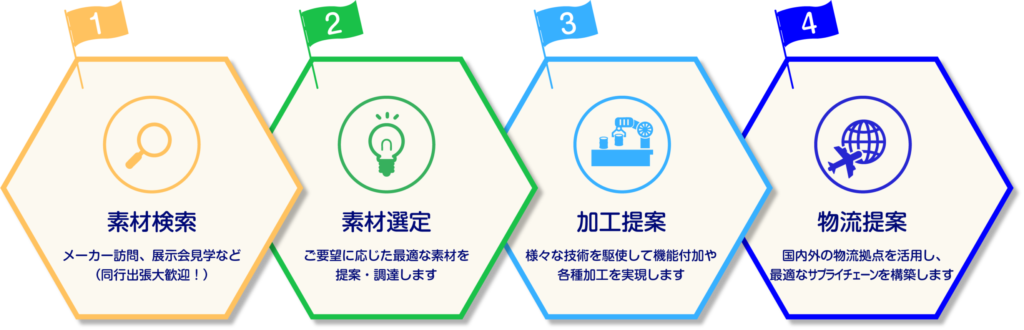 素材の選定、最適な製法や加⼯アプリケーションのご提案だけでなく、商品化へ向けたパッケージング、デザイン、物流などサプライチェーンの構築もサポートいたしますので、商品化へ向けたトータルサポートが可能です。